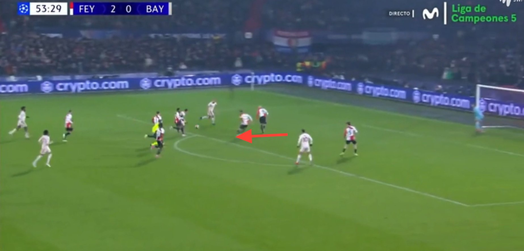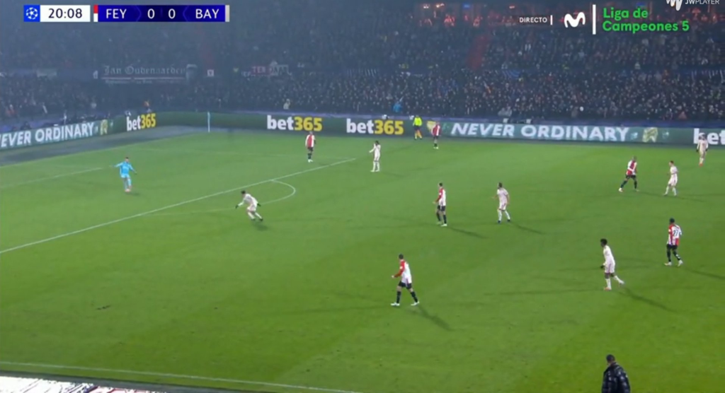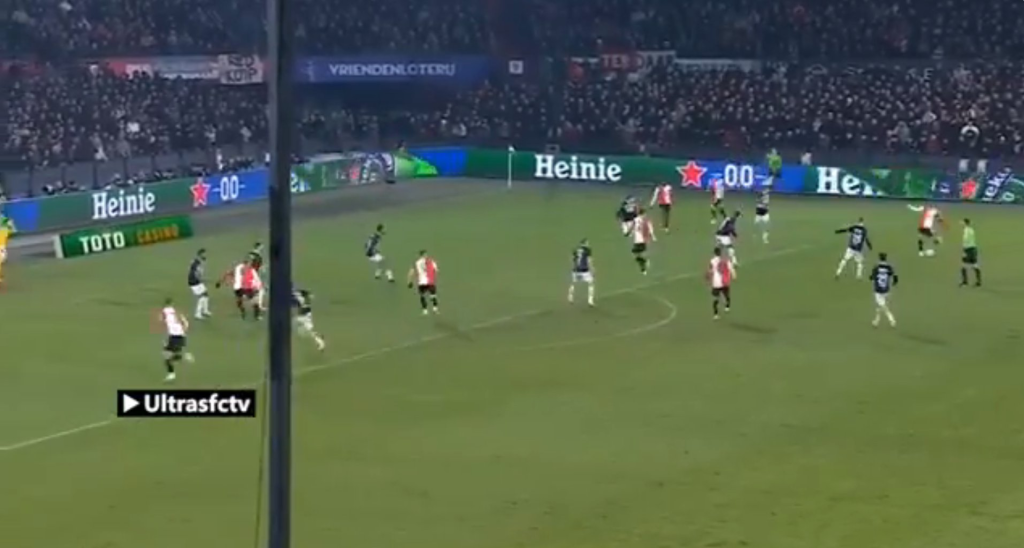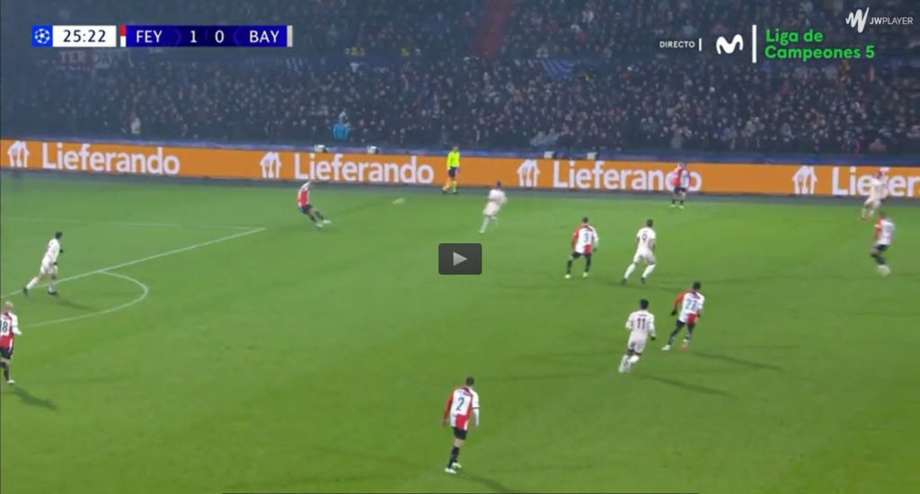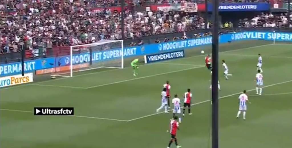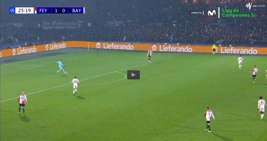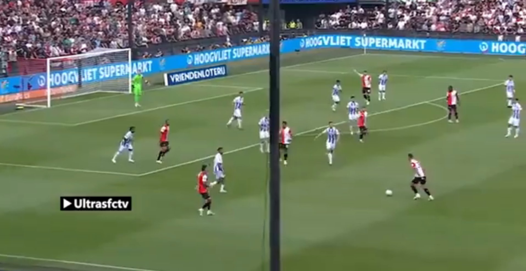 Jeho najčastejším riešením pod tlakom je však dlhá lopta, čo bolo vidieť aj v prechádzajúcom videu vyššie – ide o jeden z nacvičených výstavbových automatizmov Feyenoordu v sezóne 24/25: