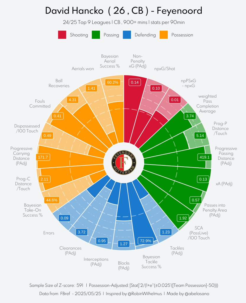 Dávid Hancko patrí v tejto sezóne medzi najspoľahlivejších a najkonzistentnejších stopérov v Európe. Vo Feyenoorde je neohrozenou súčasťou základnej zostavy ako stredný obranca, zatiaľ čo v reprezentácii Slovenska hrá kľúčovú rolu na ľavom kraji obrany.