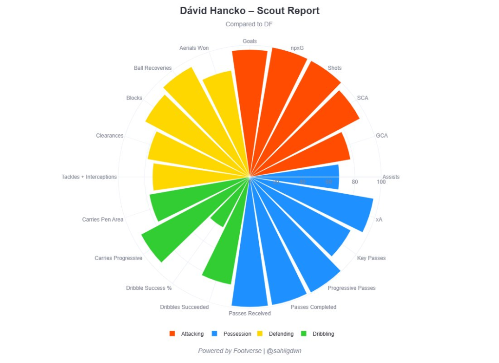 Dávid Hancko je typ stopéra, ktorý hrá veľmi „optimisticky“ – výborne pozná svoje silné stránky a vie ich využiť. Dokáže predvídať smer vývoja akcie, aby včas vystúpil, získal loptu alebo zavrel voľný priestor.