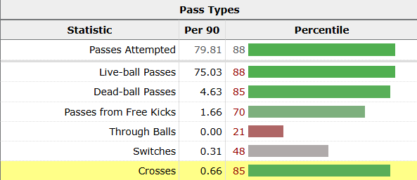 Patrí sem aj centrovanie – Slovák má veľmi dobrú kopaciu techniku, dokáže posielať do šestnástky vysoké „nájazdové“ lopty aj prudké prihrávky. V tejto štatistike patrí medzi obrancami do 85. percentilu.