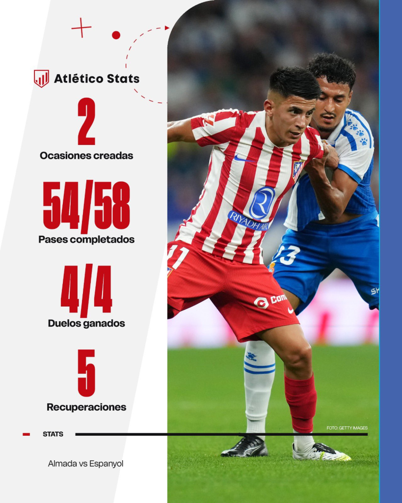 Atlético si naďalej vedelo vytvárať nebezpečné situácie v útoku a Barrios po príchode na ihrisko pôsobil fantasticky – neustále lámal súperovu líniu svojimi prienikmi s loptou. Dokonca boli veľmi blízko k jednému z gólov kola. Tá akcia vyzerala ako z videohry: Barrios, Almada, Baena a Julián si rýchlo vymenili niekoľko prihrávok v spleti nôh obrancov Espanyolu a celé to zakončil bývalý hráč City strelou do žrde.